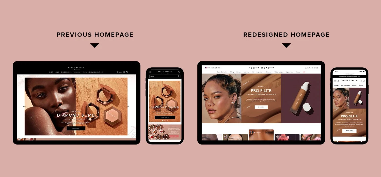 The FentyBeauty.com homepage needed a redesign to better reflect the brand’s evolving identity, improve visual impact, and make content more accessible to a broader audience.