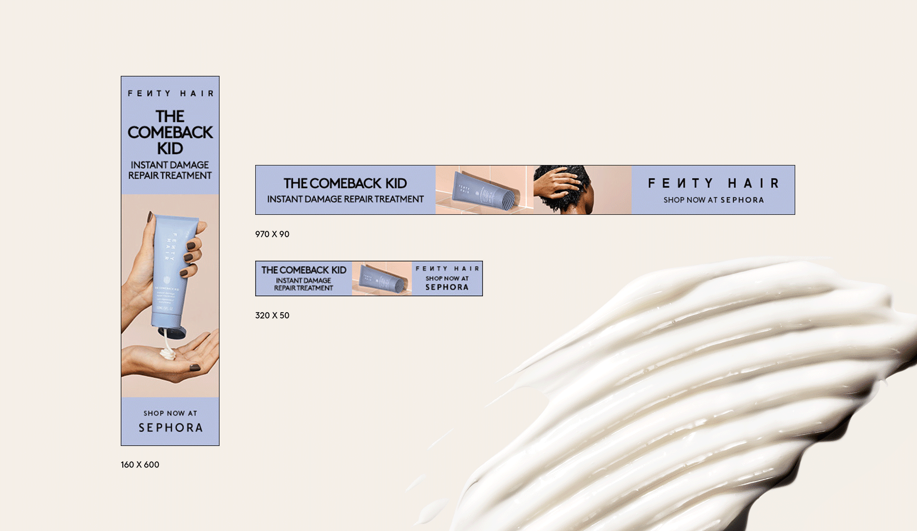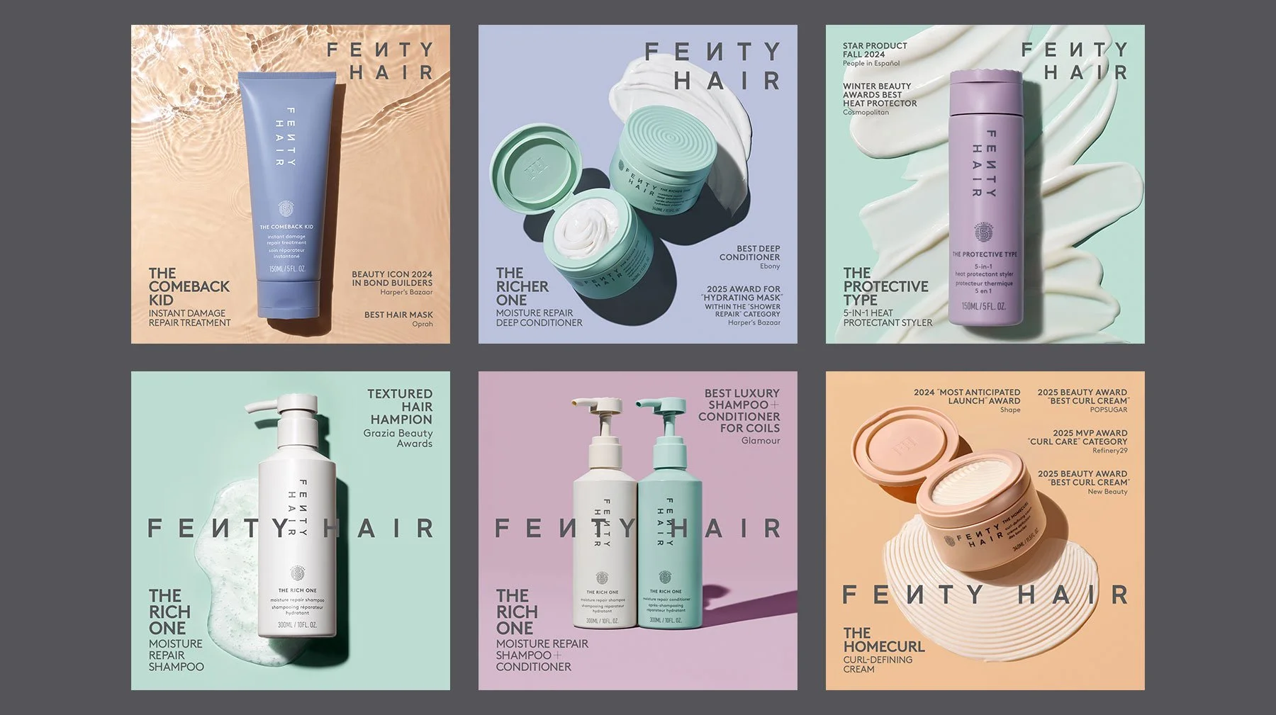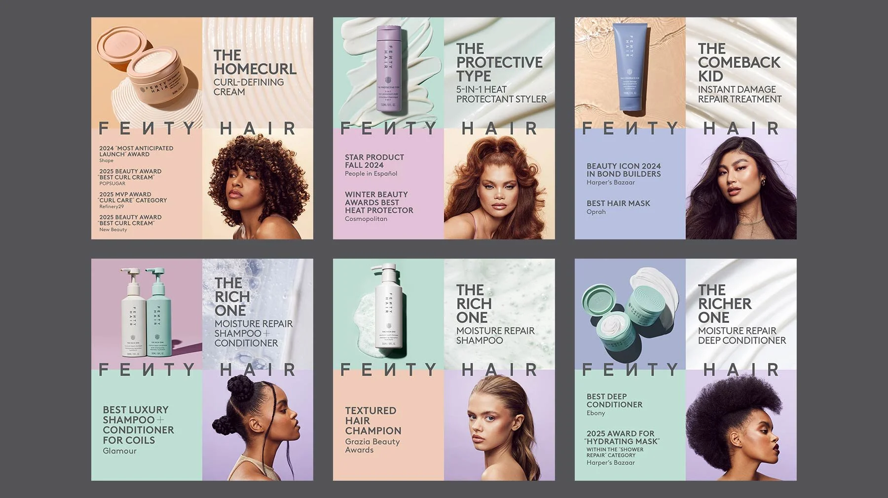 As Digital Design Director, I partnered with the Fenty Hair brand team to develop bold Instagram and programmatic display campaigns supporting product launches and beauty award recognition. The work balanced immediate, attention-grabbing creative with consistency across the broader Fenty Beauty brands portfolio, leveraging our “wildpost” poster-grid design system while ensuring Fenty Hair maintained a distinct tone, color palette, and visual presence.