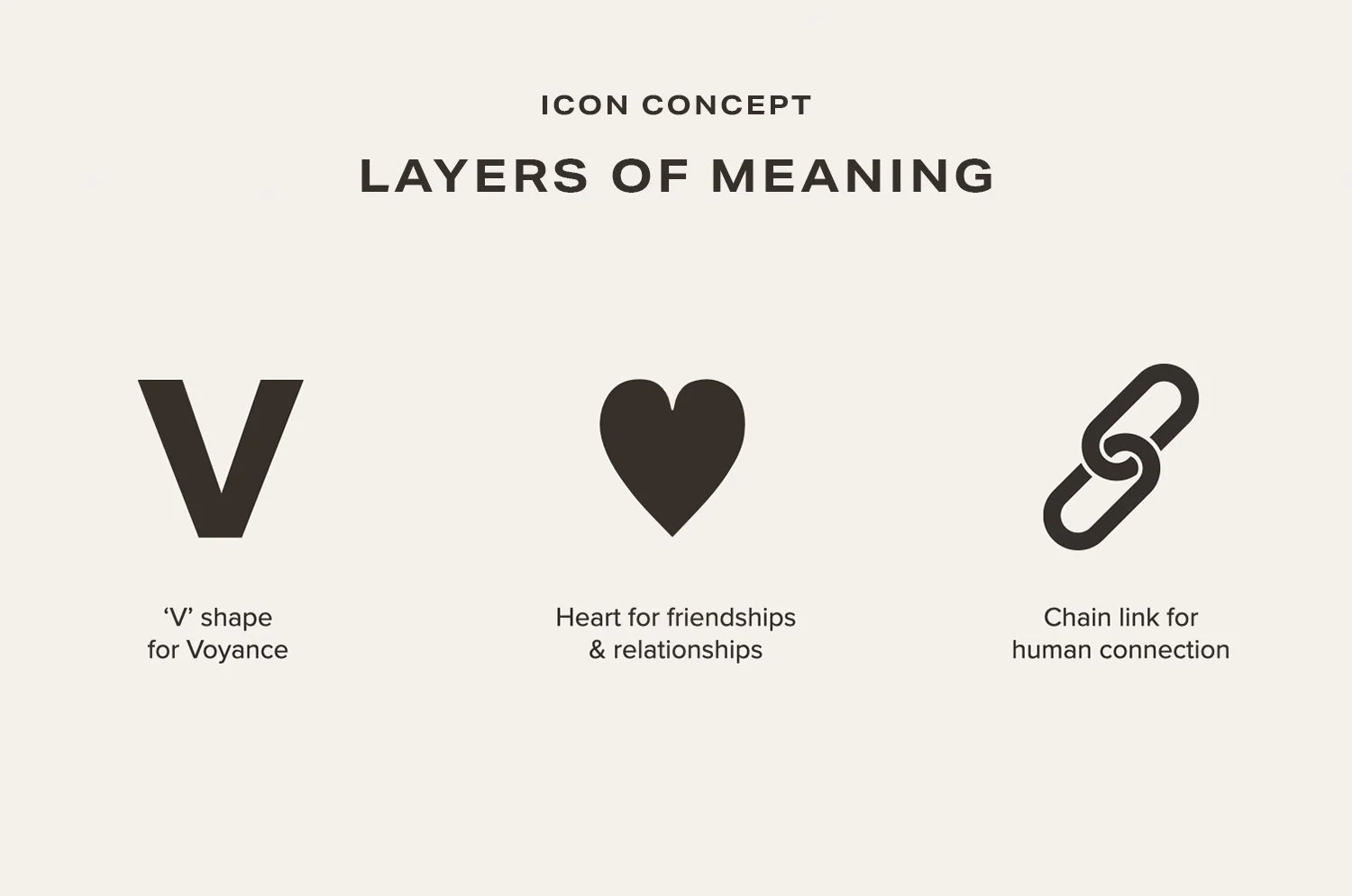 Icon, logotype and brand identity for Voyance, an AI-powered app that manages your social calendar using data from your text message conversations. The founders wanted the icon to symbolize human connection and relationships. The layers of shapes and meaning in the icon include a ‘V’ for Voyance, a heart for friendships and relationships, and a chain link for human connection.